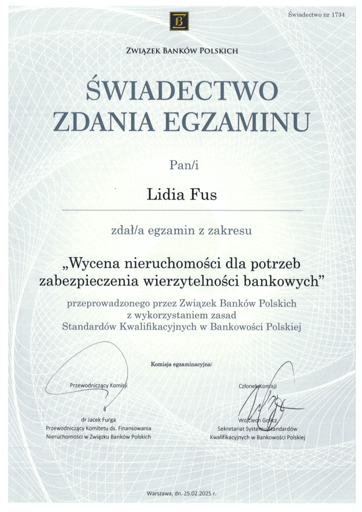 Profesjonalizm i rzetelność to fundamenty naszej działalności. Posiadane certyfikaty oraz uprawnienia potwierdzają nasze kompetencje w zakresie wyceny nieruchomości, gwarantując najwyższą jakość usług,